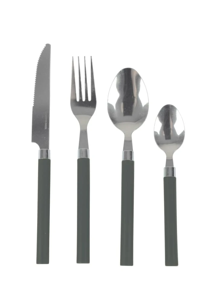 Praktische bestekset bestaande uit een vork, mes, lepel en koffielepel. Gemaakt van RVS en een kunststof heft.
