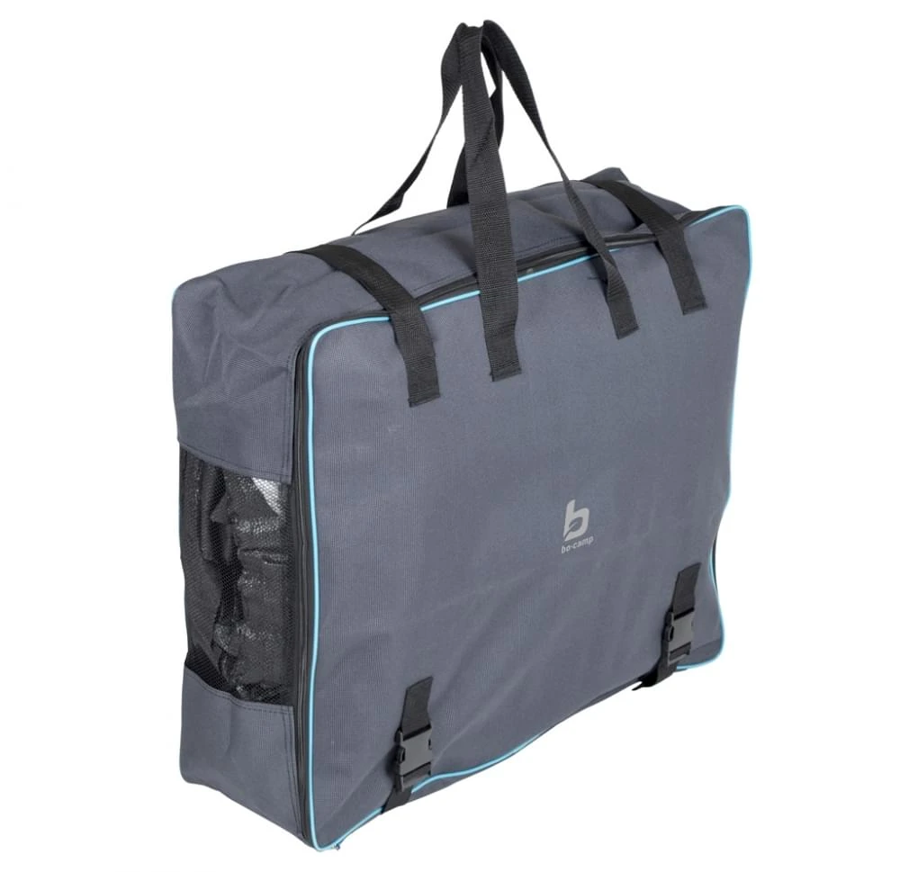 Het is fijn om al je campingspullen netjes op te bergen of te vervoeren en dat geldt dus ook voor je tenttapijt. Met deze Opbergtas van Bo–Camp vouw je simpelweg je tapijt netjes op en plaatst hem in de tas, rits dicht en je neemt de tas eenvoudig mee door de lange hengsels. Het is een ruime opbergtas van 55 x 65 x 20 cm, is voorzien van gaas aan de zijkant wat er voor zorgt dat als je tapijt nog vochtig is dit goed ventileert, maar heeft ook spanbanden om je tapijt goed strak in te pakken.